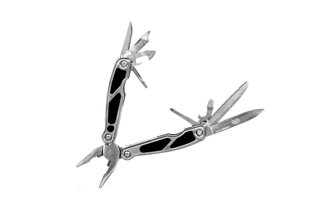 Пассатижи, нож, нож серрейторный, крестовая отвёртка, открывалка, шило, пилка, консервный нож, развёртка, светодиодный фонарь.